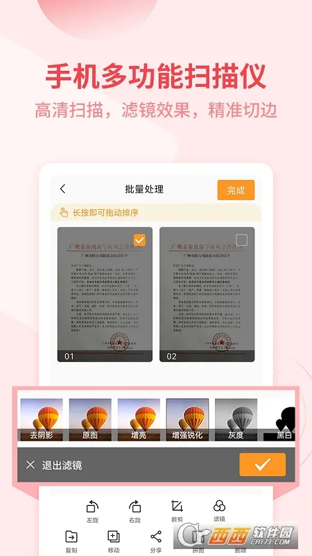 金舟扫描助手超好用!它能把手机变成便携扫描仪,满足办公学习和生活的各类纸质材料数字化需求。文件扫描时,有多种拍摄选项,还能从相册导入图片自动裁剪生成标准扫描件。证件扫描针对常用证件设计专属模板,能精准还原尺寸,替换背景。图片编辑有多种滤镜,可自由裁剪突出关键信息。文档管理能对已扫描文档重命名、合并、删除等,支持批量保存至相册,历史记录自动归档。文件操作可拼接图片、制作带加密水印或自定义尺寸的PDF文件。优势亮点众多,智能裁剪技术自动识别文档边界,多格式输出,有批量处理能力,跨平台分享便捷,界面简洁易上手。适用场景广泛,无论是办公文书处理、学习资料整理,还是证件电子化备份等都很实用,能帮你轻松解决各种扫描需求,赶紧试试吧!