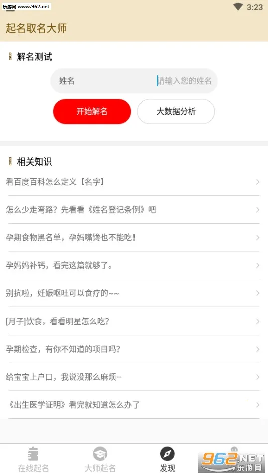 3. 具备解名测试,能全方位分析姓名运势,可在微信朋友圈分享美名,还提供起名政策流程等知识,方便宝宝上户口。