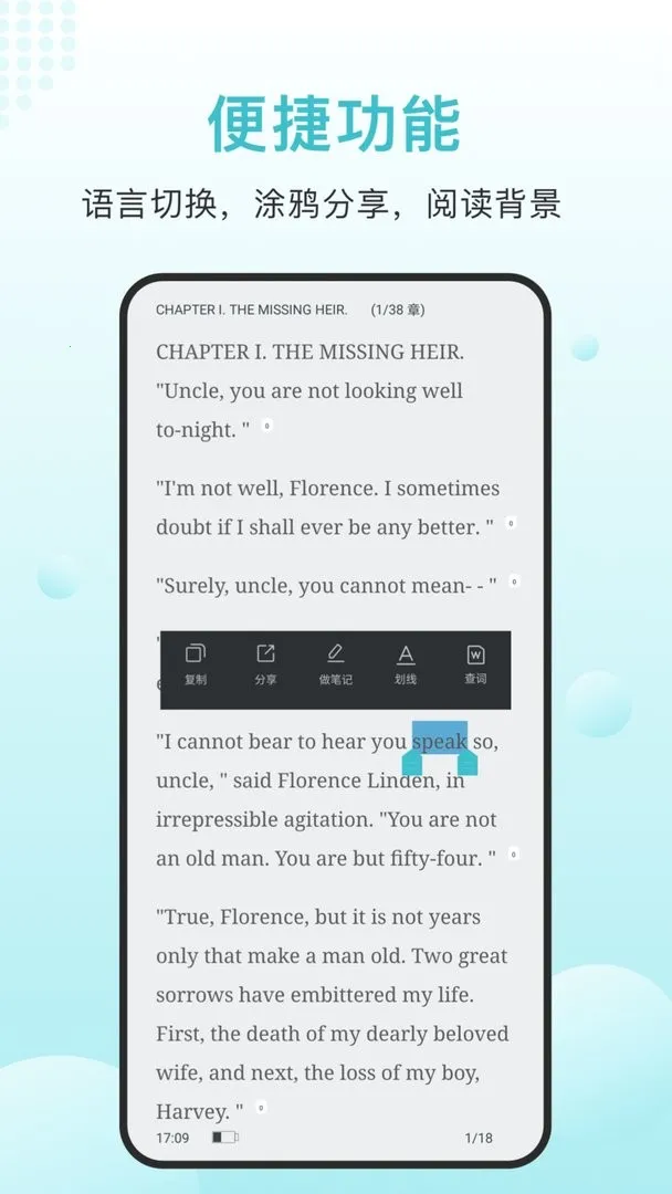 3、多样学习功能便捷:支持一键加入书架和书签,方便管理且支持离线阅读;有阅读圈子可分享笔记经验;提供纯中文、纯英文及中英对照翻译服务;查词翻译功能强大,还有单词本方便温习。