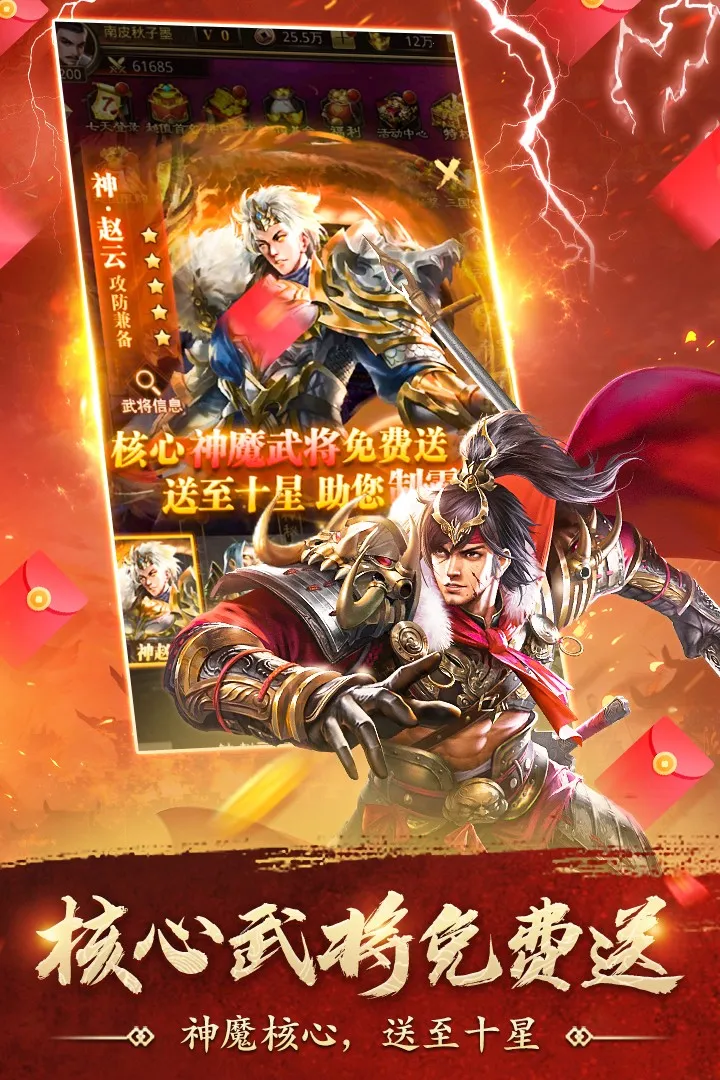 丰富玩法,策略多样:拥有丰富多样的PVP战斗模式,真实策略战场。魏蜀吴神魔五大阵容相互克制,不同搭配碰撞火花,还有完善的武将养成路线和多样化阵容配置系统。