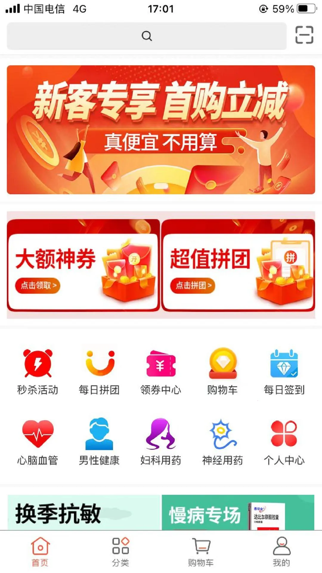 支持对症找药,能依据疾病症状快速锁定所需药品类型,精准找药。提供每日拼团活动,选择商品拼团购买可享优惠。设有领券中心,能查找并一键领取购物优惠券,购物时自动抵扣。有季节用药板块,可查找各类季节性药品资源在线购药。还支持商家入驻,以及签到赚钱功能,连续签到能获专属奖励。商品品类丰富多样,涵盖中西药品、个护保健品、隐形眼镜、医疗器械、美妆个护等,满足多样化购物需求,让在线购药省心方便。