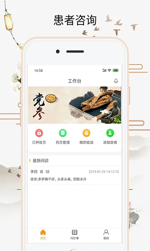 4. 便捷问诊:灵活应用远程问诊,图文电话信息咨询,辩证开方,快捷发送智能问诊单,自定义患者管理。