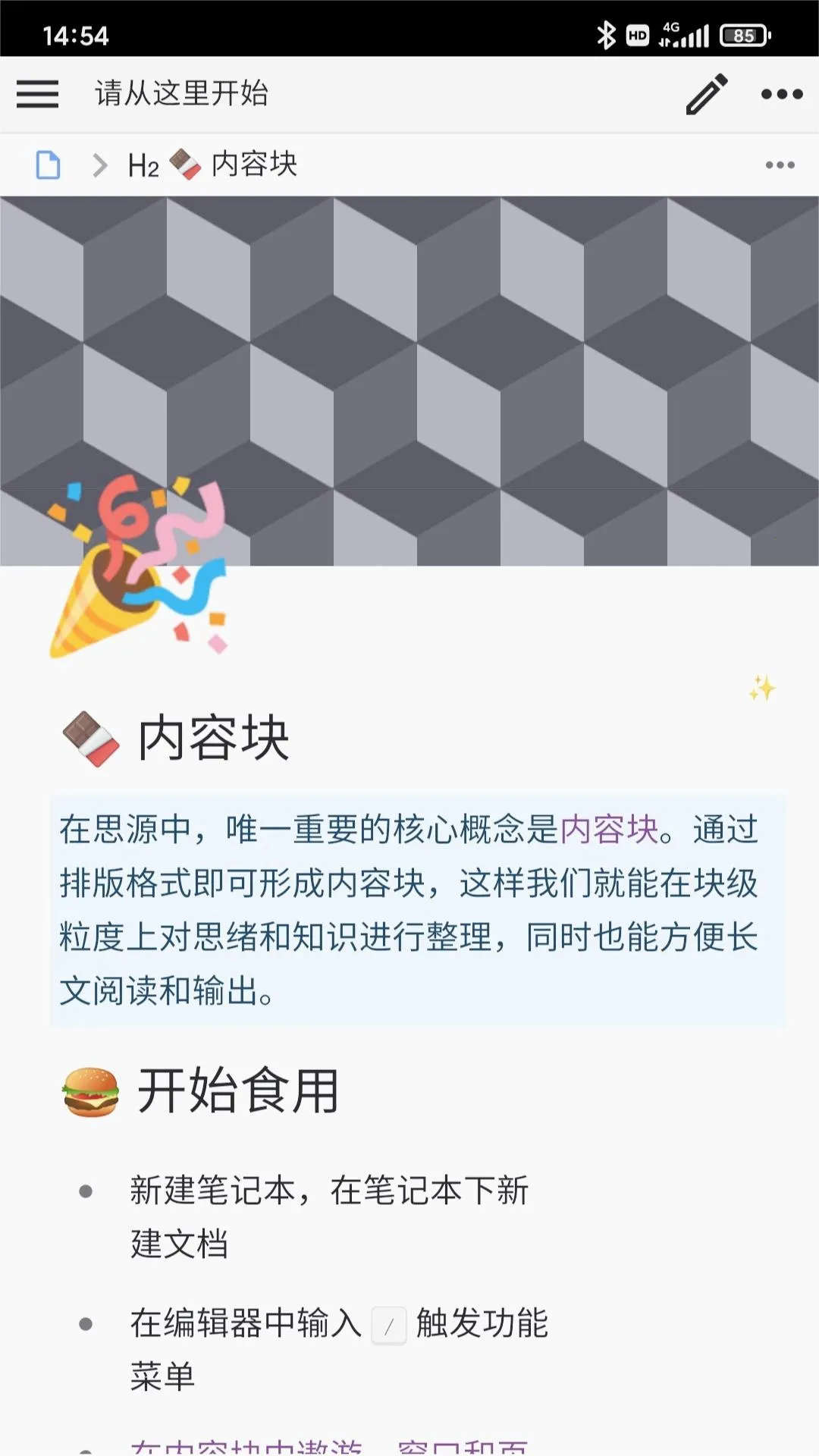 使用起来很方便。新建笔记本与文档后,进入编辑器按段落书写,每个段落可视为内容块,用标题分段,关键结论写成独立块,方便复用。输入特定触发符号就能呼出功能菜单,快速排版。文档树可直观呈现笔记层级,方便知识整理。还支持立即同步,多设备间保持内容一致。