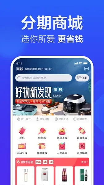 其额度最高可达20万,一次申请可循环使用。放款速度快,线上自动审核,最快1分钟放款。申请全程线上进行,无担保免抵押。涵盖取现、消费分期购物等多项服务,还有国美门店分期购、国美商城打白条等,满足多种购物需求。
