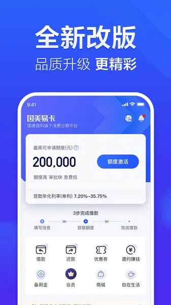 国美易卡安卓版是国美金融旗下消费分期平台,结合线上线下,提供借款、分期购物等服务。额度高放款快,申请简单,支持多种还款方式,还有专属分期商城,安全保障高,助用户轻松解决资金需求。