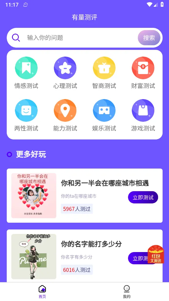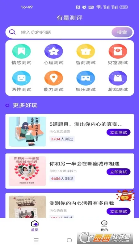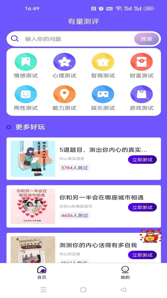 有量测评是一款超有趣的多类型娱乐测评工具,涵盖情感、心理、财务、智商、两性等题材。它能满足不同用户需求,让你在休闲时享受丰富娱乐体验。操作简单,不同年龄段用户都能轻松上手。