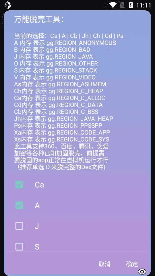 万能脱壳工具(安卓脱壳分析工具)可对安卓加壳应用脱壳,有多种剥皮算法、一键式去皮等特性。能在Root或虚拟沙箱运行,进行DEX文件提取等分析,兼容性强,可稳定运行于不同安卓系统。