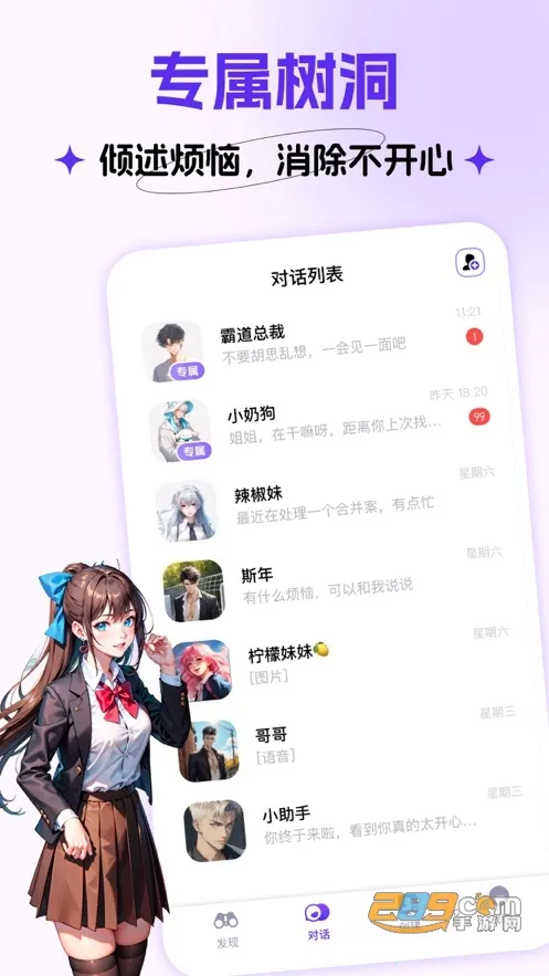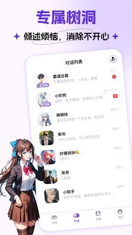专属树洞倾诉烦恼:各种烦恼能在专属树洞大胆说出,只有虚拟恋人倾听,提供解决方案,24小时陪伴。