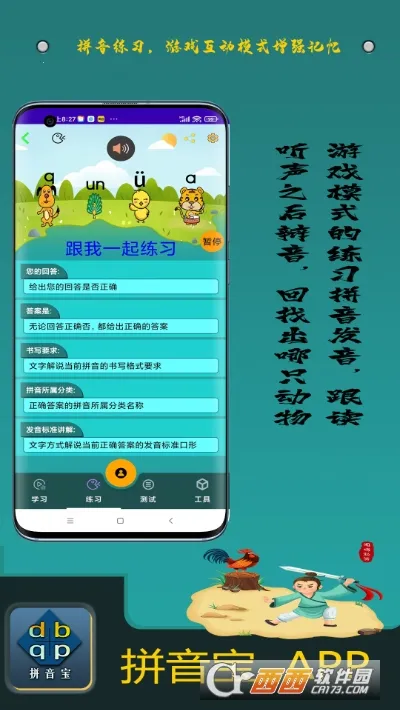 拼音宝是一款专为0-6岁学龄前宝宝打造的拼音学习软件。它紧扣语文教学大纲,覆盖所有拼音知识点,包含83节课程。专业老师亲自示范发音方法,解析发音难点和重点,让孩子们发音更准确;示范书写规范,确保孩子们书写标准美观。软件通过情景式拼音教学,设置多种主题场景,让学习更有趣。真人口型示范与AI童声识别技术结合,课程体系科学。还设置了上万个闯关关卡,每次学习关卡不同,玩得久学得就多。此外,它还有丰富的在线查询功能,如汉语字典、成语词典等。能帮助孩子在轻松愉快的氛围中掌握拼音知识,激发对拼音学习的热情,是一款不错的拼音学习软件。