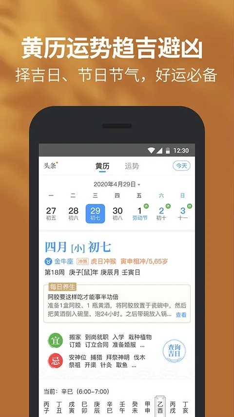3. 黄历功能超丰富,融合传统文化,提供详细老黄历信息,包括每日宜忌、吉生肖和吉日选择等,还有生日提醒、节日安排及传统养生建议。