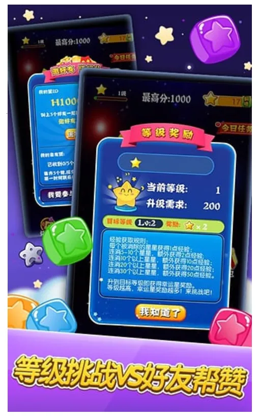 这是一款休闲益智的消除类游戏,玩家通过点击相邻同色星星来消除得分。游戏画面清新,玩法简单易上手,没有关卡限制。它有多种游戏模式,能满足不同玩家需求。设有丰富的每日登陆奖励、每日任务和等级挑战等内容。还具备多玩多得机制,玩家可获取精品道具。游戏中,玩家需观察棋盘星星分布,规划消除顺序触发连锁反应,以获取更高分数,应对难度递增的关卡挑战,享受轻松愉悦又具策略性的消除体验。