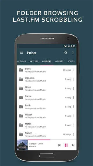 Pulsar脉冲音乐播放器手机版是一款出色的音乐播放器。它支持大部分音乐格式文件,播放方便。多种搜索方式让找歌迅速,输入关键词就能快速定位想听的歌曲。界面优美简约,操作轻松,还支持专辑、艺术家、流派等多个分类,便于按歌手或专辑查找管理音乐。其设计遵循Google Material Design,分类管理播放音乐便捷,能自动下载显示专辑封面和艺术家图片。智能播放列表实用,搜索快速,支持无缝播放等众多功能。在音乐播放体验上表现出色,无论是日常听歌还是管理音乐库,都能满足需求,是一款值得推荐的安卓音乐播放器。
