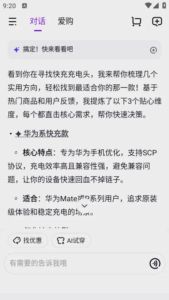 提供专业导购知识,告别关键词搜索,简单说出需求就能召唤私人买手,精准锁定商品。