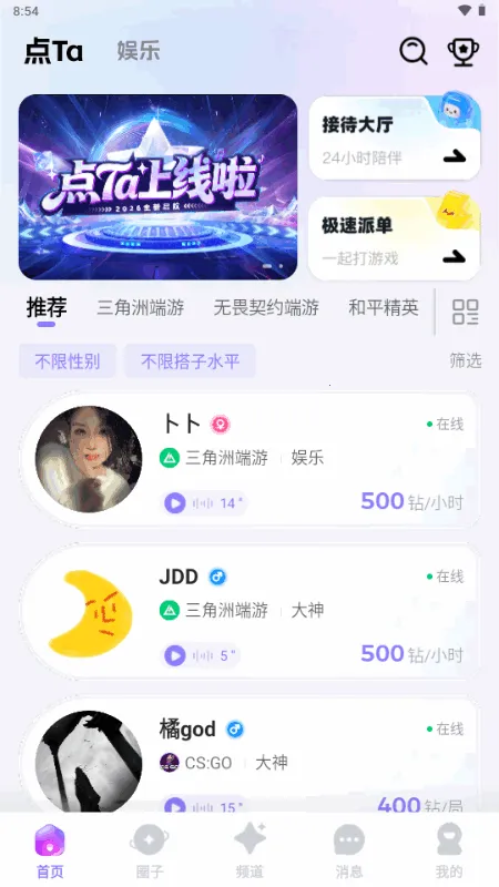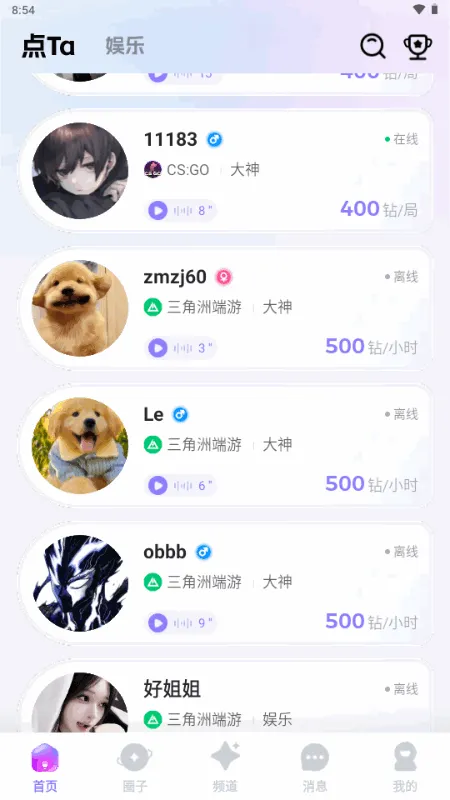 1. 丰富多样的搭子类型:有专业电竞搭子在线带飞,助你摆脱坐牢局稳上大分;娱乐陪玩搭子随心选,甜妹音搞笑男陪你边打边唠。全平台热门游戏全覆盖,精准匹配你的游戏需求。