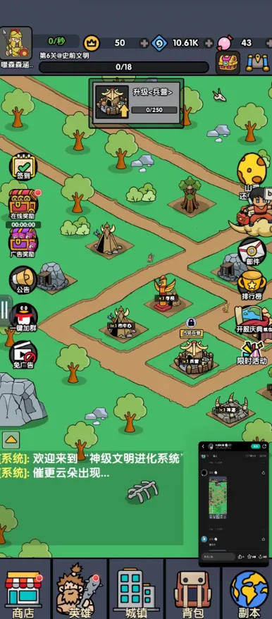 这是一款融合放置挂机与文明进化的模拟经营策略手游。玩家化身原始部落族长,带领部落从低级文明逐步进化到神级文明。游戏通过养成英雄推进主线,英雄星级影响战斗和建筑产出。