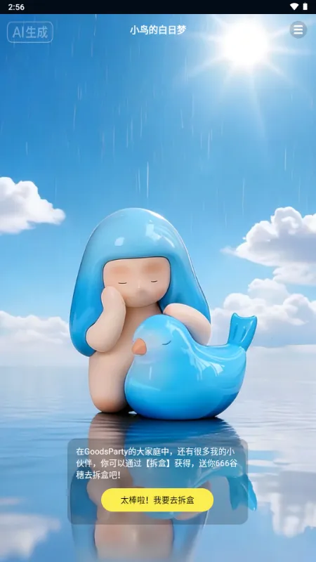 GoodsParty谷子派对是二次元爱好者专属软件,融合潮玩文化与虚拟互动。有百款正版授权虚拟盲盒,潮玩手办可AI陪聊,还有集虚拟换实物、潮玩搭子视频陪聊等功能,更新后新增签到领奖励拆盒。