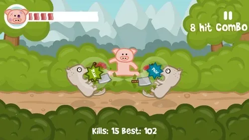 3. 操作简单易上手:只需通过攻击、跳跃、下蹲等简单粗暴的动作组合,一键就能控制小猪,搭配快节奏音效,可对狼进行连环进攻。