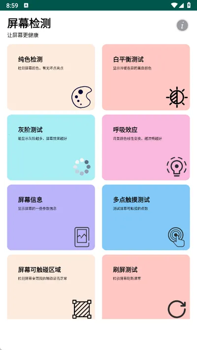 想检测手机屏幕和触摸功能咋样?这类软件能帮大忙!它能全面评估手机屏幕健康状态,支持LCD和OLED等多种屏幕类型,快速识别亮点、坏点及图像残留等问题。有多种颜色模式测试,像红绿蓝白黑等,各种显示效果都能覆盖到。还能测试屏幕支持的最大触控点数,确认触控功能是否正常。操作超简单,打开软件就能按需求选检测模式,比如纯色检测、白平衡测试、灰阶测试等,软件会展示结果,让你清楚屏幕状况。而且它无后台启动,不耗流量和内存,保护隐私。支持Android 1.5以上版本,兼容性好,适配多数手机款型。界面简洁清新,上手快,有多达8种检测模式,从不同维度全面评估屏幕健康,真的超实用!