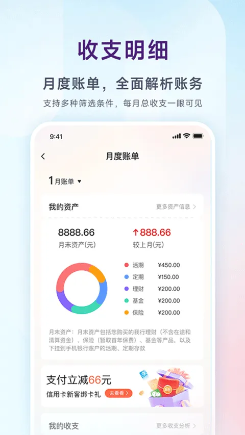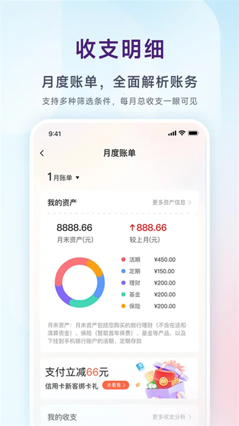 **其优势显著**:首页财富信用卡理财全新改版,旅程便捷操作简单;千人千面实时触达视频播放指纹转账等多种能力加持,带来多元化体验;全面整合网点服务、生活服务、体验反馈、安全服务,一键触达多元化服务;还有主题皮肤、月度账单、生日祝福、节日提醒等贴心陪伴。每次升级都致力于提供更好服务体验,是一款值得信赖的银行手机应用。