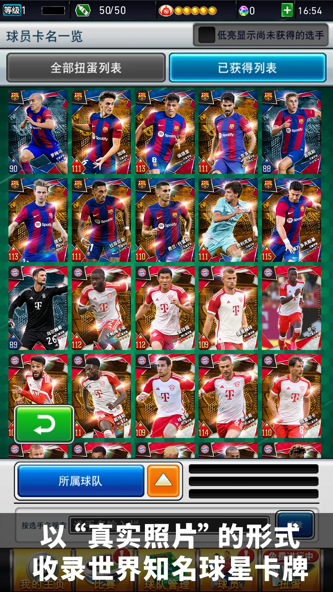 丰富球星卡牌收集:以真实球员照片形式收录众多世界知名球星卡牌,包括阿根廷、巴西、葡萄牙等国家队劲旅,以及巴萨、利物浦、阿森纳等著名球队的明星球员,可收集球星组成专属最强球队。