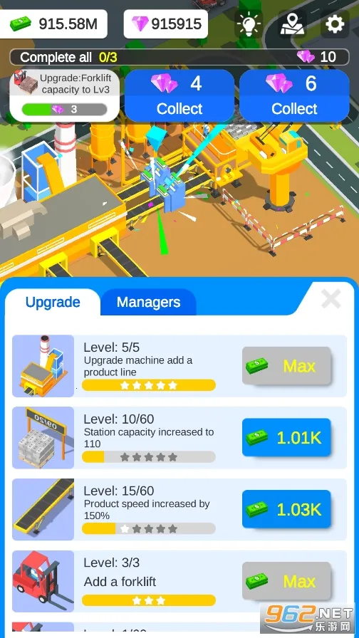 拥有升级系统,可不断升级沙场设备、招募优秀员工、建造新建筑,稳固整体市场地位,推动生意持续发展。