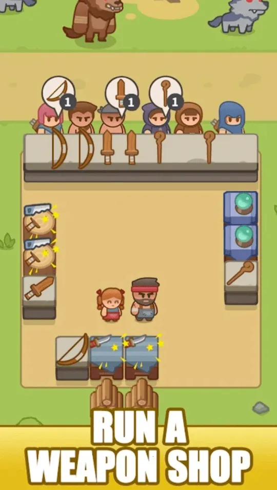 这是一款休闲放置类模拟经营游戏。你将经营武器商店,为猎人提供武器补给。从基础武器制作开始,升级铸造台解锁强力武器。随着等级提升,能在更多区域建店。游戏中,点击白色方框建铸造台,制作武器可升级,客人购买武器带来收益。还能用金币招揽客人、招募学徒提高效率。特色是制作出售各类武器,满足不同猎人需求。亮点包括组建探险小队冒险得资源奖励,管理升级店铺增加武器选择,自由定制店主服装吸引顾客。