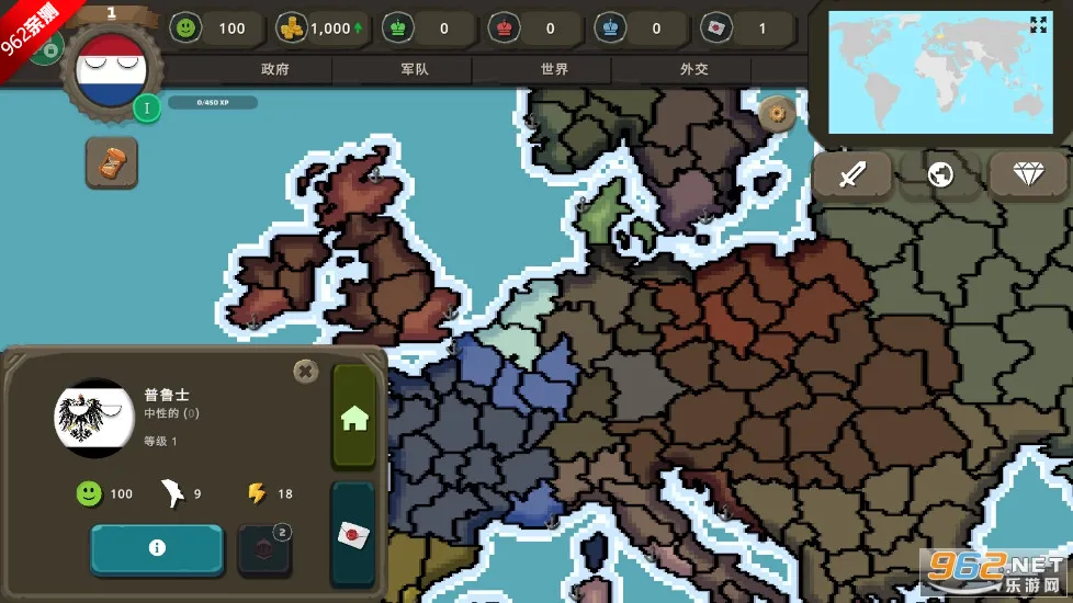 3. 发展要素丰富:要建设强大军队,控制税率提高人民幸福感,升级国家,还要开发荒地获取资源,解锁新技能和装备提升综合能力。