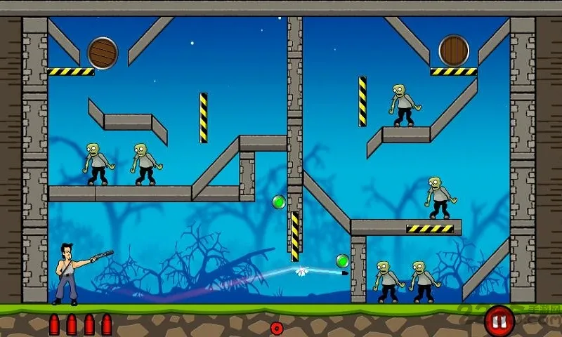 《愚蠢的僵尸最新手机版》是一款以末日僵尸为题材的射击闯关游戏。玩家扮演僵尸猎人,用特制子弹,借墙体弹射杀僵尸。关卡众多,难度递增,需熟悉地图、观察僵尸分布、利用障碍物反弹,合理规划弹道并节约子弹。