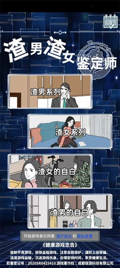 渣男渣女鉴定师是一款手绘卡通风格的休闲解谜游戏。玩家化身鉴定师,在各种情景找线索推理真相,结合轻松画风与烧脑玩法。通过点击观察、与NPC对话、用道具系统等,多章节关卡等你来挑战。