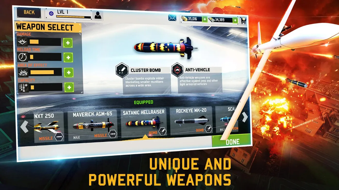 2、战机升级细化部件:完成任务可获现金与金块奖励,用于机库深度改装。除更换无人机平台,还能单独升级关键部件,显著增强作战能力,优化性能参数,让战机适应严苛任务条件,在高强度对抗中占优。