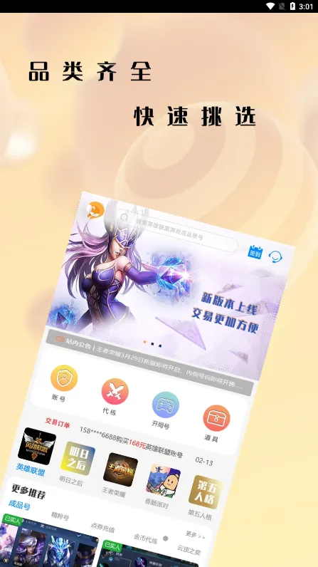 4. 交易类型多样:不仅支持账号交易,还能买卖游戏道具、装备、皮肤等稀有资源,满足玩家多样需求。