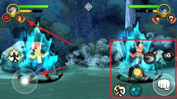 4、左边摇杆是移动,右边按键分别是技能攻击,防御,上方蓝条满了可以释放大招。