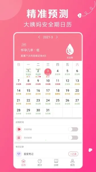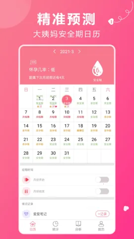 可根据例假周期生成下次例假大概时间,方便用户提前做好准备,还支持私人定制。