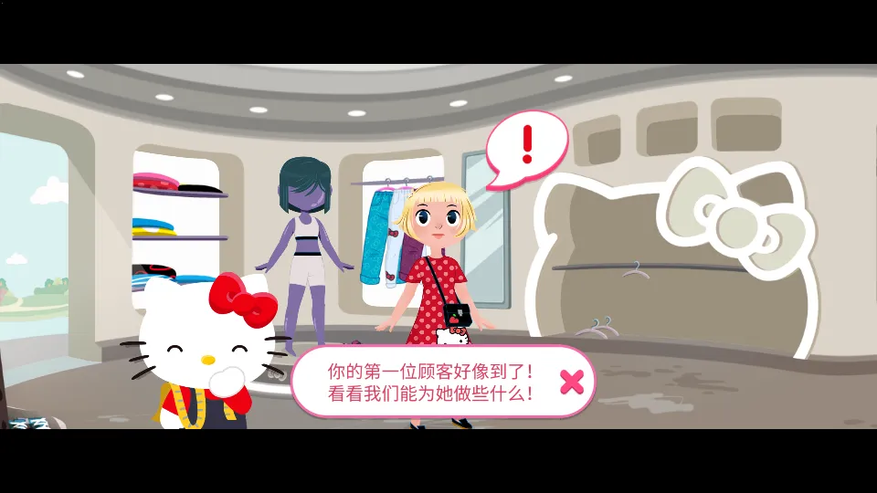 2、玩家将来到凯蒂猫的服装店铺,点击“!”接待第一位顾客。