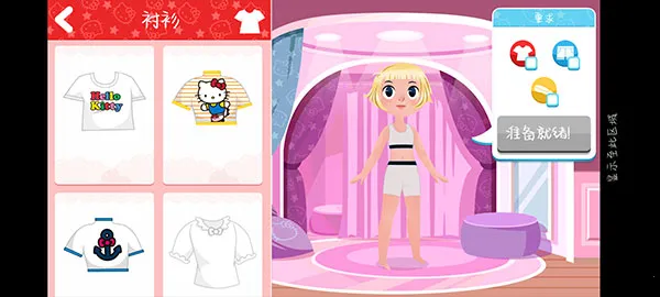 游戏玩法简单易懂,玩家打开游戏后,点击屏幕中间的开始按钮,来到凯蒂猫的服装店铺,点击接待顾客,了解用户需求后,点击开始为顾客搭配时装。右上角是顾客对时尚搭配的特定要求,对应左边的服饰栏,玩家需要按照需求为顾客挑选好看的衣服,设计魅力形象。最后,完成后点击准备就绪进入到拍照宣传页面,挑选最喜爱的造型照片为门店宣传。