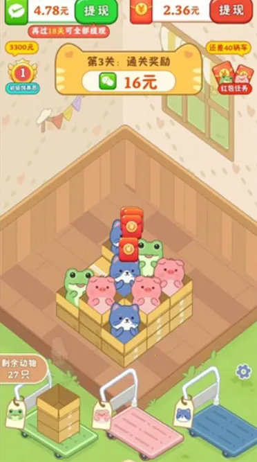 猫咪请就位红包版是一款趣味十足的休闲赚钱游戏。可爱猫咪角色与丰富关卡设计,极大增添了趣味性和可玩性。玩家能不断解锁新猫朋友,体验多样游戏乐趣。其玩法简单,将三个相同猫咪消除打包成盒就能过关,消除越多红包越多。游戏画面简洁美观,色彩绚丽立体,带来欢乐视觉体验。操作通俗易懂易上手,老少皆宜。随着关卡提升,难度增加但都有红包奖励。收集道具可助力猫咪消除,匹配相同猫咪能一次消除多个,利用特殊猫咪可产生大范围消除效果。而且真能赚钱,动动手指消除猫咪,现金红包自动到账,新用户立得0.3元提现,猫咪等级越高可提现金额越高,整体画风超萌,非常值得一玩。