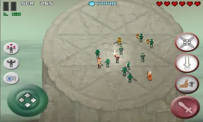 游戏中有战士、弓箭手、巫师等多种职业,每个职业都有特殊技能。玩家通过滑动屏幕控制角色移动,利用左下方虚拟摇杆控制角色跑动,点击右下角红色按钮挥剑攻击。右上方红心代表血量,血量耗尽或掉下祭台游戏结束。击杀敌人可获金钱,用于购买装备提升角色能力。随着游戏推进,难度逐渐加大,敌人数量增多,需不断加强角色能力。有些敌人被击杀会变成血液和钻石,要及时收集。游戏采用复古像素美术风格,配合街头手游设计,带来强烈怀旧感。无尽模式中,大量敌人袭来,战斗热血刺激,玩家需升级装备应对强大敌人。
