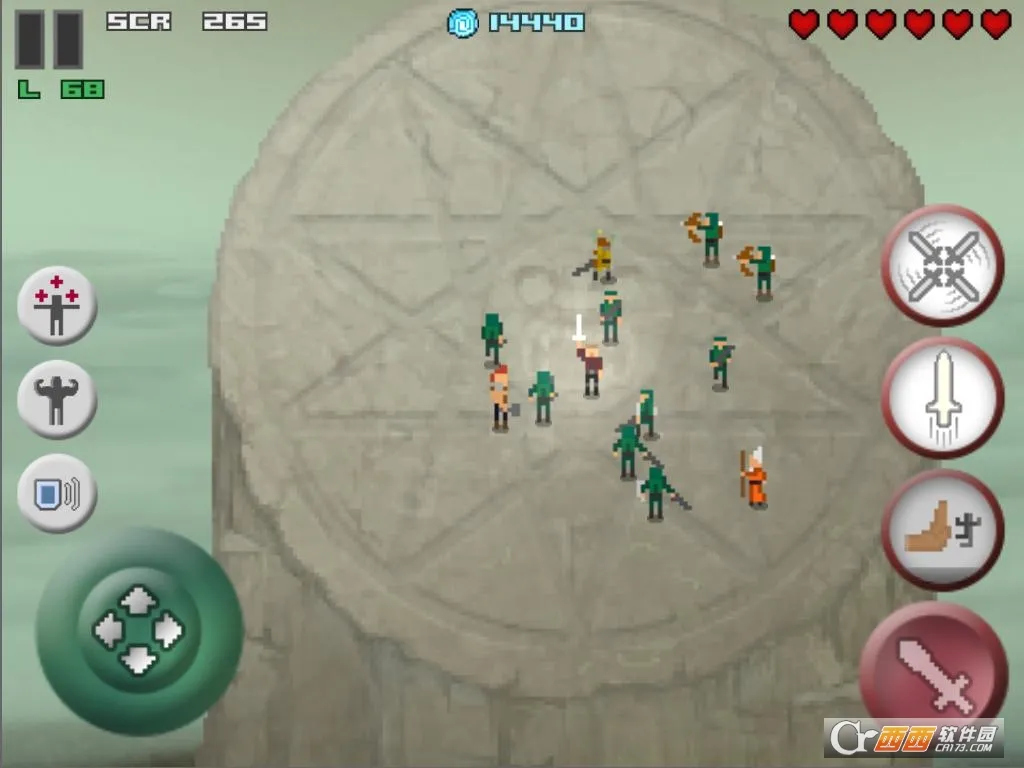 游戏玩法丰富,在神圣祭坛上杀光敌人才能幸存,利用屏幕左侧虚拟摇杆控制角色,手持魔法剑杀敌并扔下祭坛。右上方红心代表血量,消耗完或掉下祭台游戏结束。有些敌人击杀后会变成血液和钻石,要及时收集。随着游戏推进,难度逐渐加大,需加强角色能力,消灭敌人可获金钱购买装备提升能力。