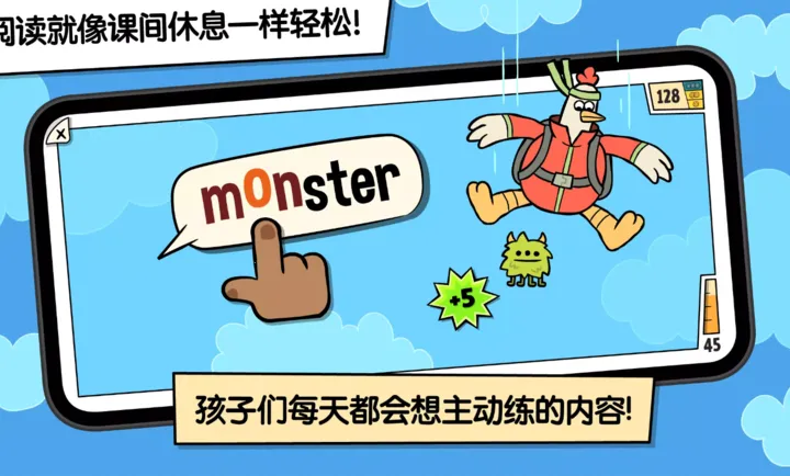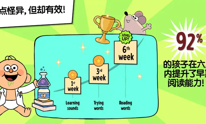 孩子能通过趣味游戏学阅读,800 多词汇扩充量。一系列游戏如小鸡抓抓乐等练自然拼读、读句子。无需 WiFi 随时畅玩,安全无广告。专为不爱阅读孩子设计,漫画与自然拼读结合,互动中培养阅读技能。与专家合作开发,科学验证有效。掌握单词赚金币解锁惊喜,建立自信。活动内容自适应孩子阅读水平,保持适度挑战。通过 25 款游戏学 800 多单词,用 UFLI 方法提升能力,离线畅玩,全家共享,认证无广告。